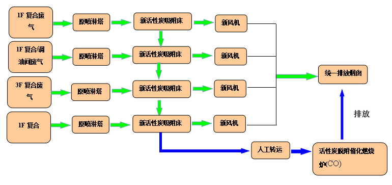 工程中在保留原有的噴淋塔情況下,獨(dú)立上新活性炭吸附床,凈化后的廢氣共用煙囪統(tǒng)一排放。吸附飽和的活性炭通過人工轉(zhuǎn)運(yùn)到催化燃燒爐進(jìn)行脫附再生,脫附抽屜和活性炭吸附床設(shè)計(jì)尺寸吻合,轉(zhuǎn)運(yùn)方便。
