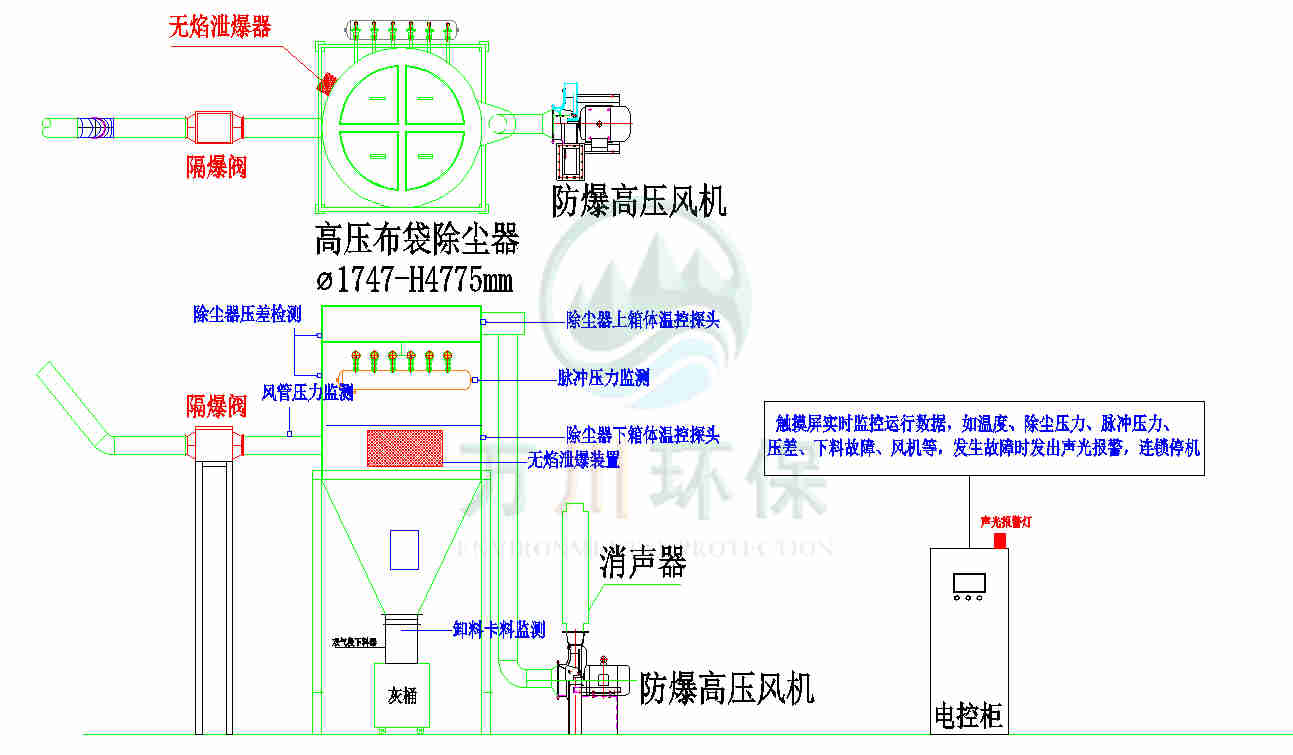 萬(wàn)川配套一套脈沖布袋除塵器+防靜電布袋+防爆除塵風(fēng)機(jī)+防爆卸料器+無(wú)焰泄爆器+隔爆+自動(dòng)化電控柜系統(tǒng)。